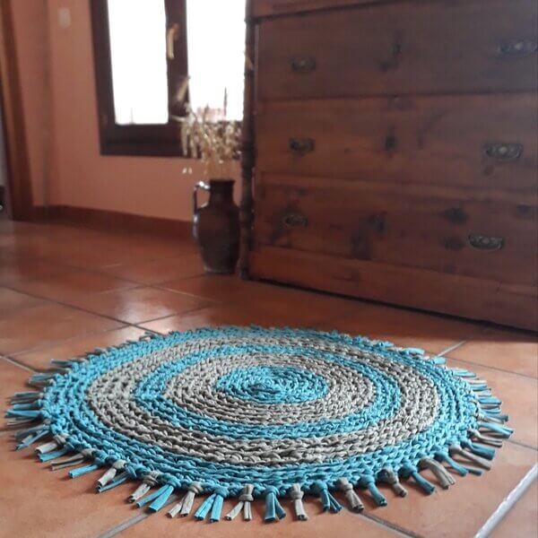 Alfombra redonda de ganchillo en dos colores. Tiene dos tonos de verde muy diferentes. Un verde caqui y un verde en un tono mar azulado. Esta alfombra circular a rayas está hecha a mano con mucho cariño y dedicación.