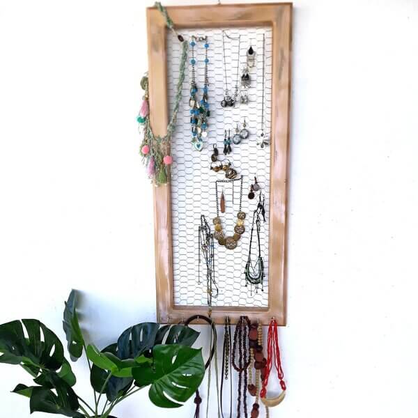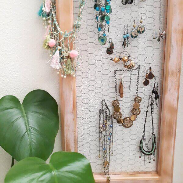 Está hecho con madera y rejilla, en la que se pueden insertar tanto pendientes como collares. Tiene, además, unos ganchos de los que colgar distintos objetos, como gargantillas y cadenas.