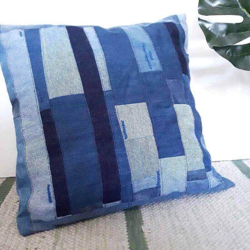Una funda de tela realizada totalmente de forma artesanal para dar un toque bohemio a la decoración de tu hogar. En color azul, está hecha a mano con trozos de tela vaquera procedentes de jeans, en lo que supone una apuesta por la reutilización y la sostenibilidad, aprovechando los retales que pueden utilizarse.