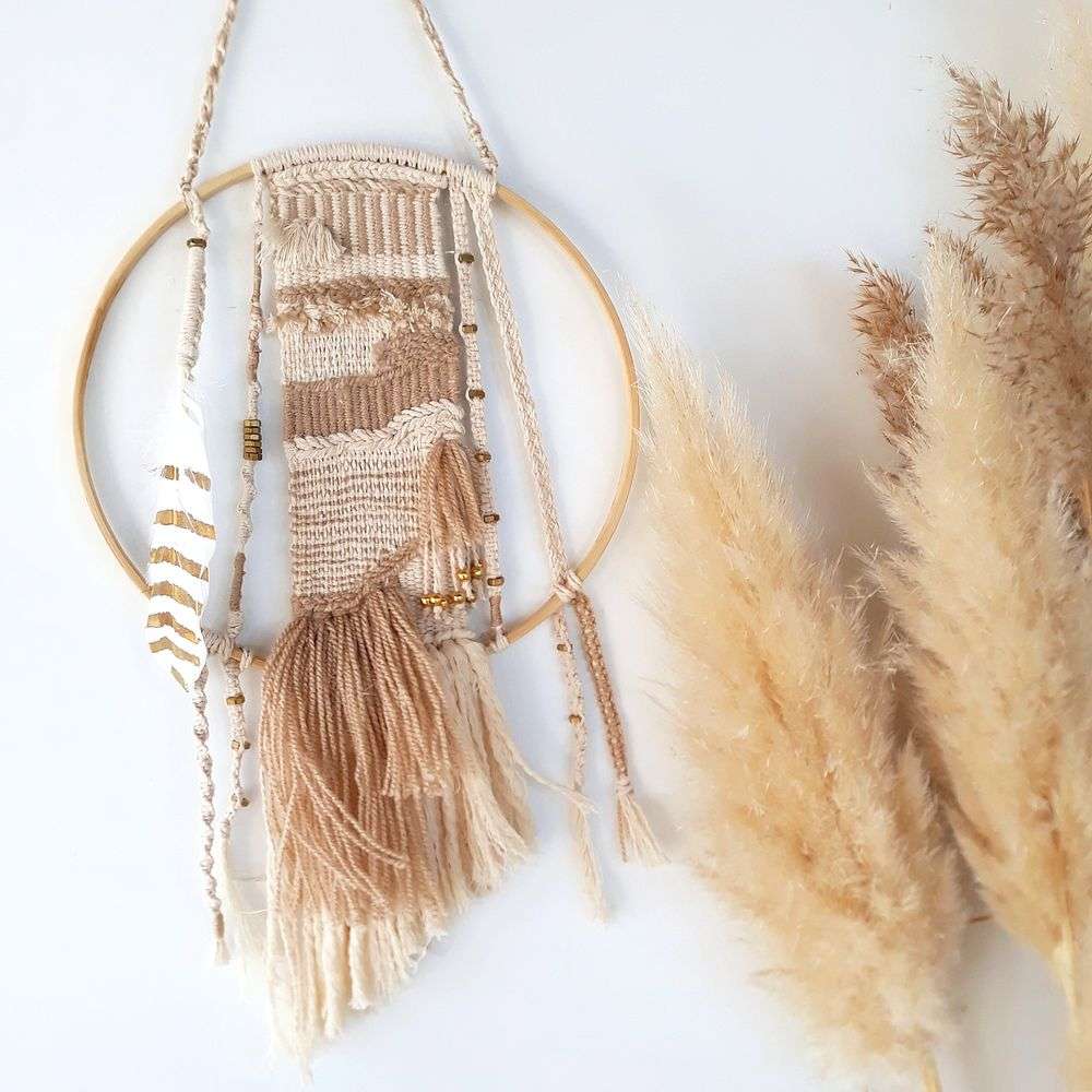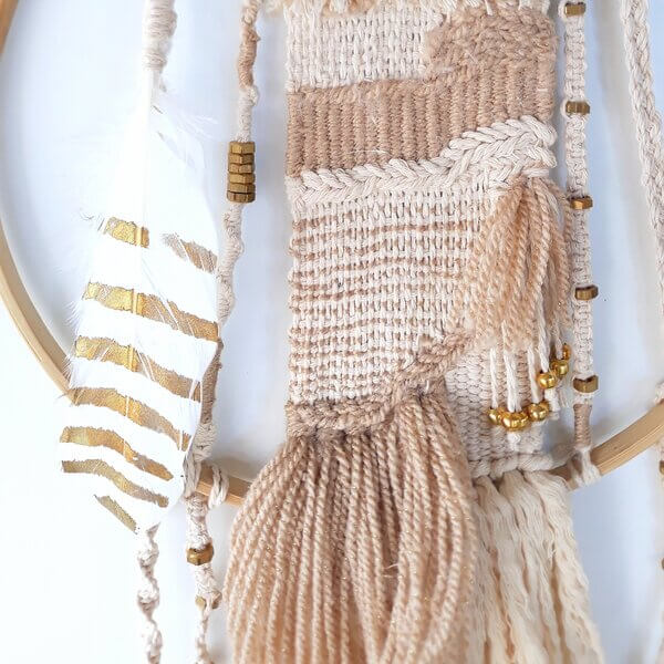 Hecho a mano con mucho mimo, este pequeño tapiz artesanal realza la personalidad de cualquier estancia con sus destellos dorados y sus tonos blancos y beige que transmiten calma y tranquilidad.