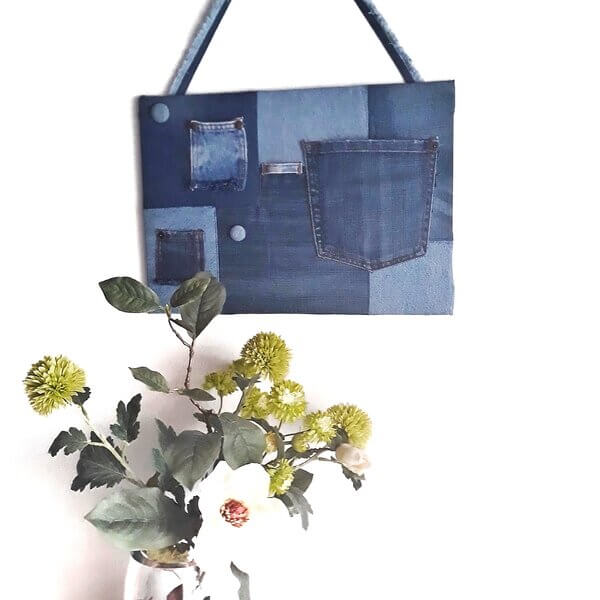 Este Organizador Tela Patchwork contiene un panel forrado con tela vaquera, que puede servir para tener a mano, por ejemplo en la entrada de la casa, las llaves, el móvil o las gafas de sol. O para colgar en la zona del escritorio y tener siempre localizados los utensilios de mayor uso. O en el salón, para tener siempre localizado el mando de la televisión. Además de los bolsillos, tiene botones forrados para colgar desde collares hasta llaves o incluso la mascarilla.