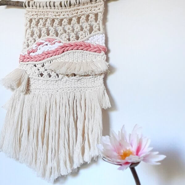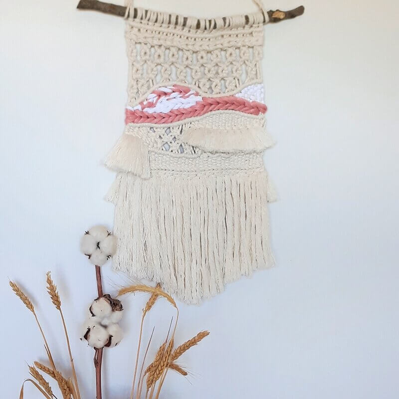 Decoración de pared única y especial para resaltar la personalidad de tu hogar. Tapiz Macramé Bohemio, con cordón de algodón de calidad y adornado con telas de colores en blanco y rosa.